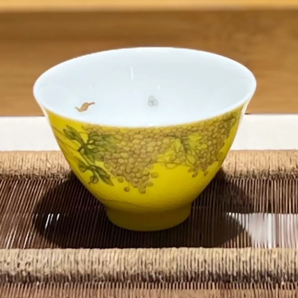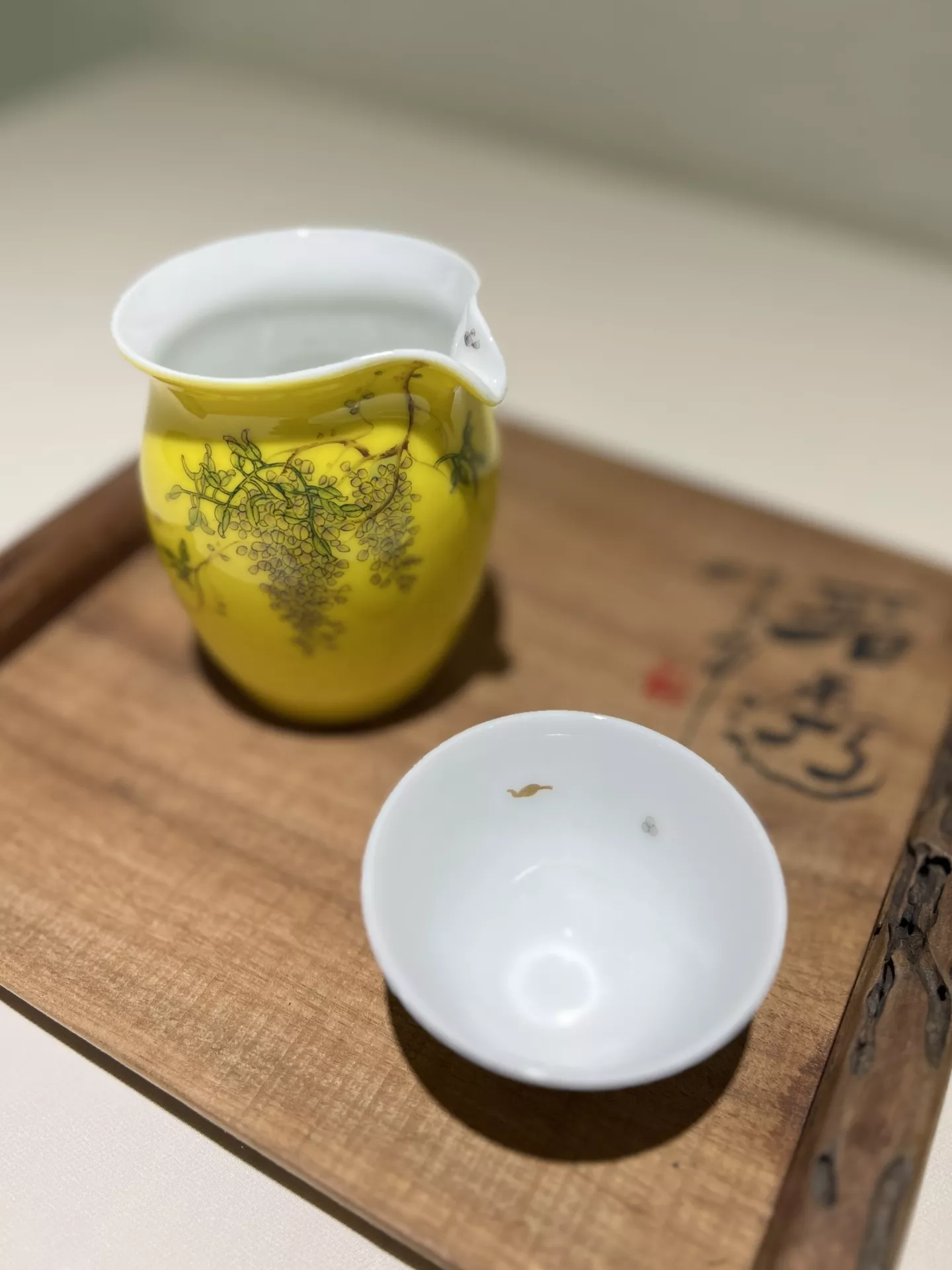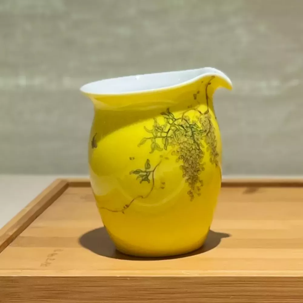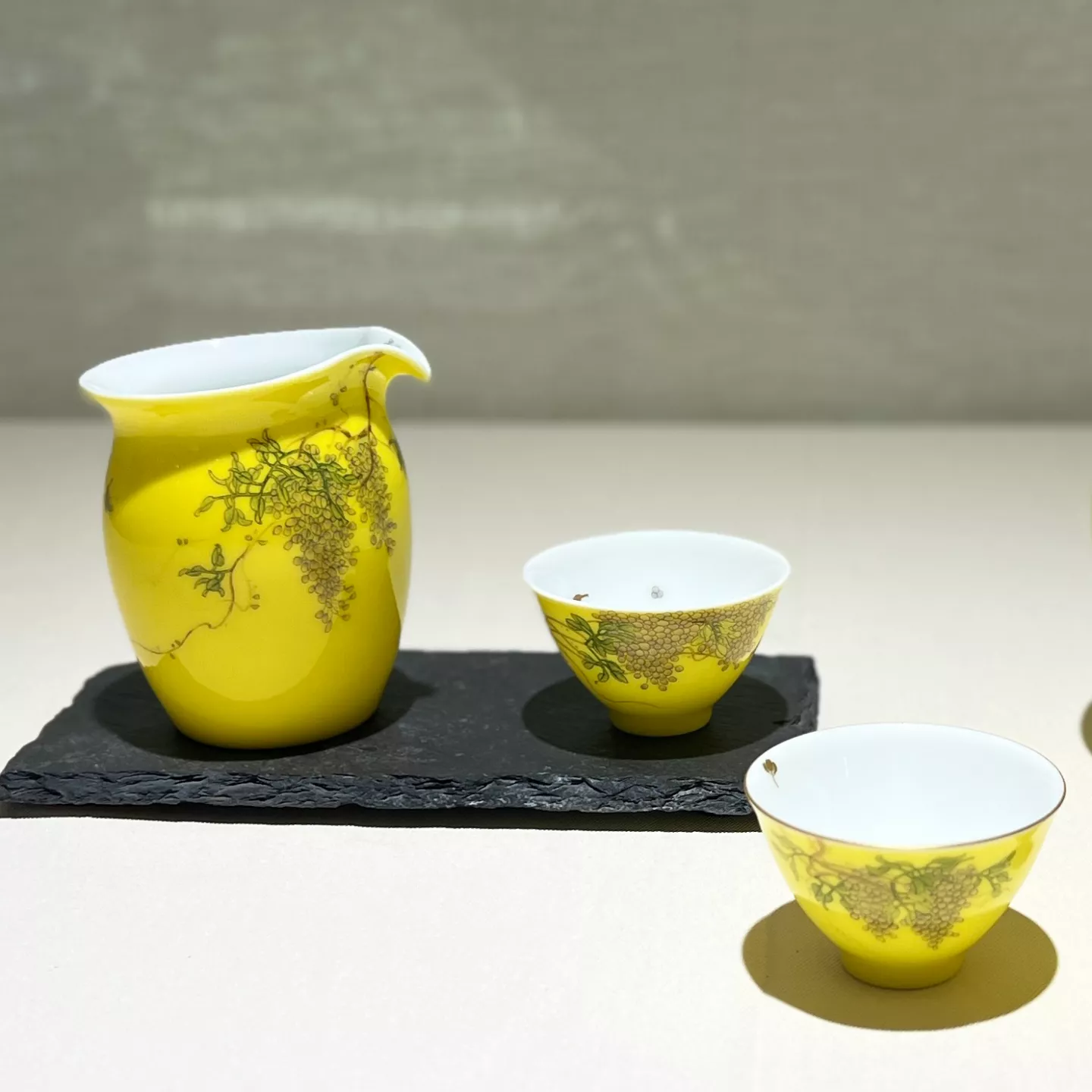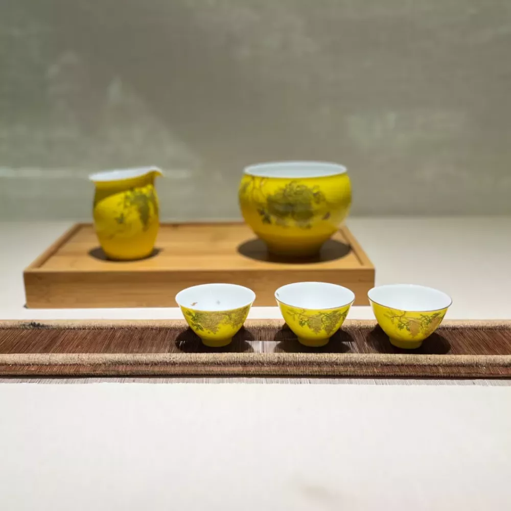此套茶器具畫工精細,使用起來符合人體工學,搭上亮黃色基底,高貴高雅,極具特色。